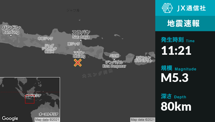 10月22日 11:21頃、インドネシアのDampitから南南西67kmの地点でM5.3の地震がありました。