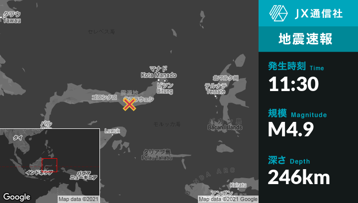 10月25日 11:30頃、インドネシアのGorontaloから東54kmの地点でM4.9の地震がありました。