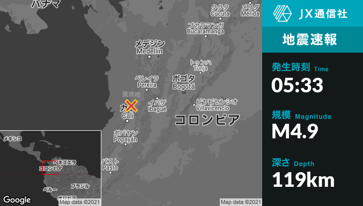 11月30日 05:33頃、コロンビアのTrujilloから西北西6kmの地点でM4.9の地震がありました。