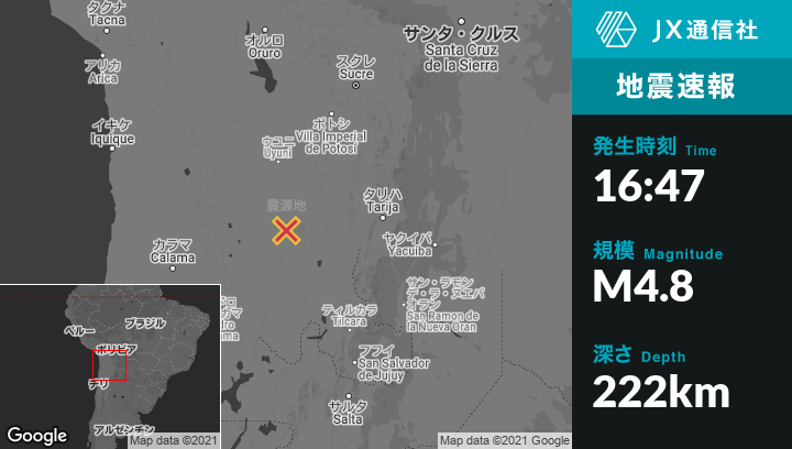 12月07日 16:47頃、ボリビアのAtochaから南南西89kmの地点でM4.8の地震がありました。