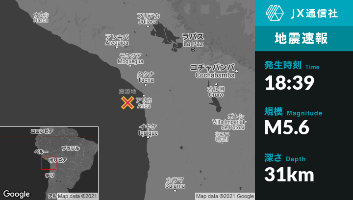 12月07日 18:39頃、チリのAricaから西南西83kmの地点でM5.6の地震がありました。