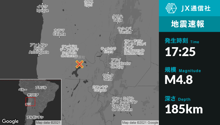 | 震源地 | アルゼンチンのSan Antonio de los Cobresから西119kmの地点 |