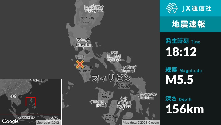 12月13日 18:12頃、フィリピンのTingloyから西南西14kmの地点でM5.5の地震がありました。