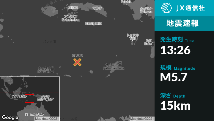 12月16日 13:26頃、東ティモールのLospalosから北東245kmの地点でM5.7の地震がありました。