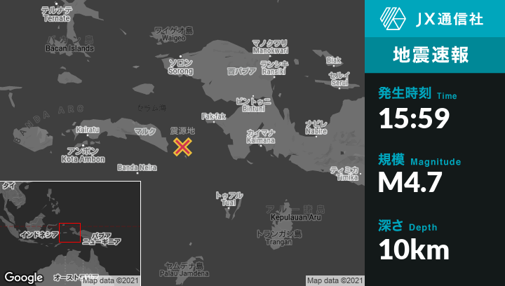 | 震源地 | インドネシアのAmahaiから東267kmの地点 |