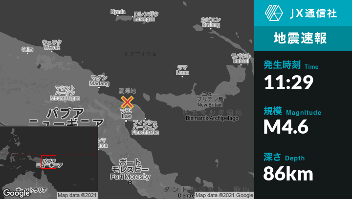 | 震源地 | パプアニューギニアのLaeから北108kmの地点 |