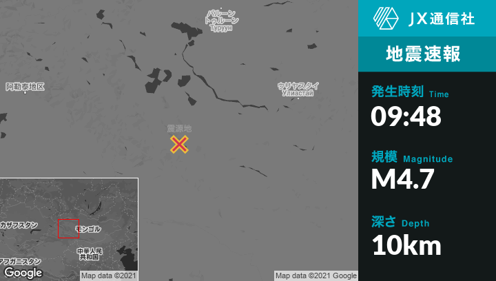 12月24日 09:48頃、モンゴルのKhovdから南東170kmの地点でM4.7の地震がありました。