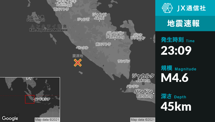 | 震源地 | インドネシアのBengkuluから南南西86kmの地点 |