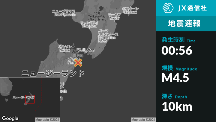 12月29日 00:56頃、ニュージーランドのBlenheimから南東32kmの地点でM4.5の地震がありました。