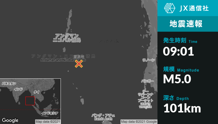 | 震源地 | インドのPort Blairから南南東221kmの地点 |