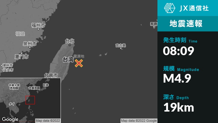 3月22日 08:09頃、台湾のHualien Cityから東64kmの地点でM4.9の地震がありました。