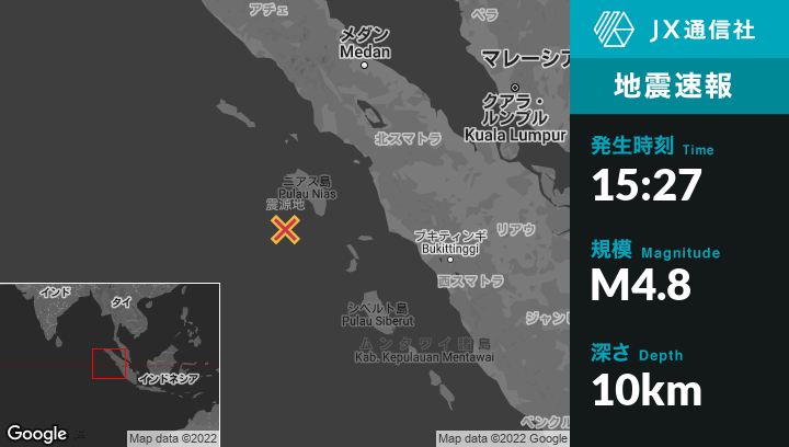 3月22日 15:27頃、インドネシアのSingkilから南南西220kmの地点でM4.8の地震がありました。