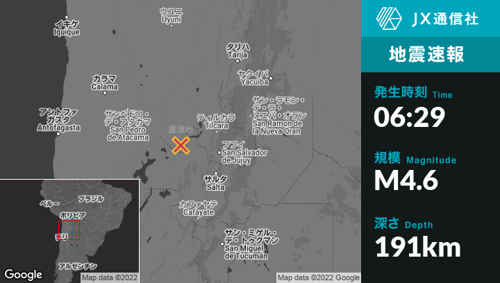 | 震源地 | アルゼンチンのSan Antonio de los Cobresから北北西45kmの地点 |