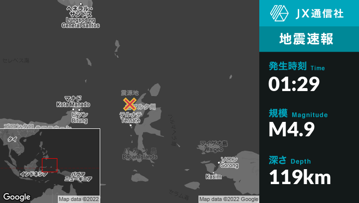 | 震源地 | インドネシアのTobeloから西77kmの地点 |