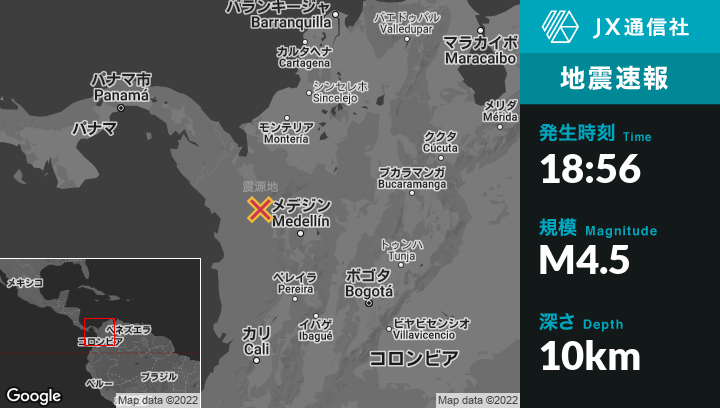 | 震源地 | コロンビアのDabeibaから西南西25kmの地点 |