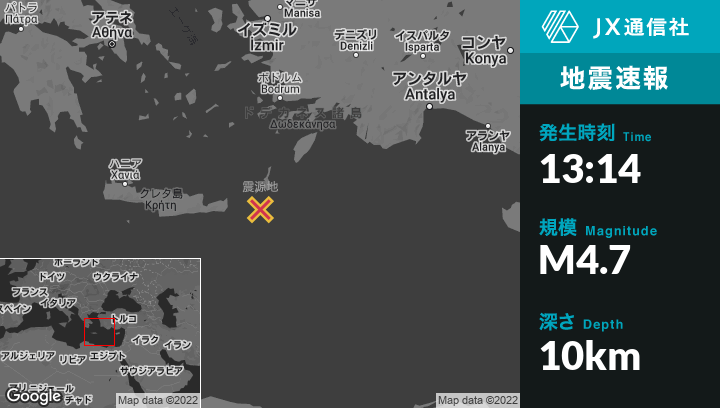 4月24日 13:14頃、ギリシャのFryから南南東29kmの地点でM4.7の地震がありました。