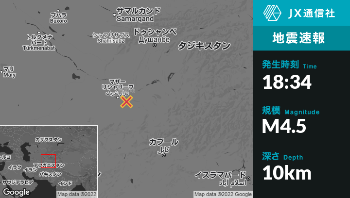 4月24日 18:34頃、アフガニスタンのKhulmから西南西17kmの地点でM4.5の地震がありました。