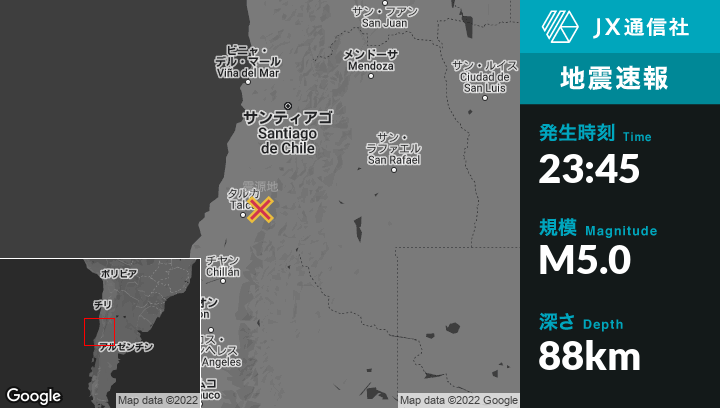 4月24日 23:45頃、チリのMolinaから南12kmの地点でM5.0の地震がありました。