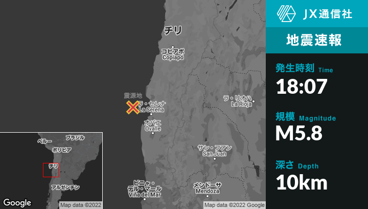 5月20日 18:07頃、チリのCoquimboから北西82kmの地点でM5.8の地震がありました。