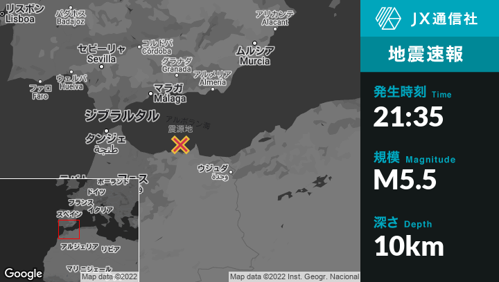5月20日 21:35頃、モロッコのAl Hoceïmaから北東48kmの地点でM5.5の地震がありました。