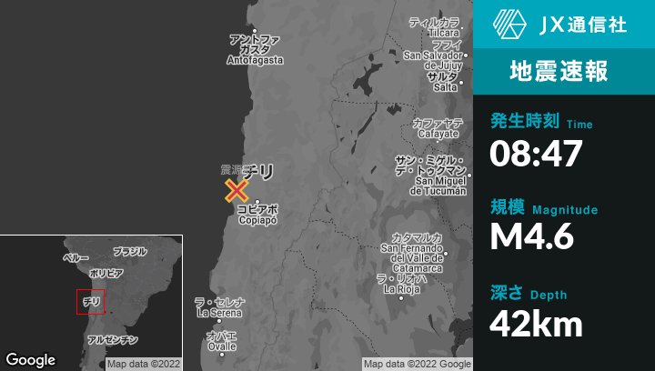5月21日 08:47頃、チリのCopiapóから北西62kmの地点でM4.6の地震がありました。