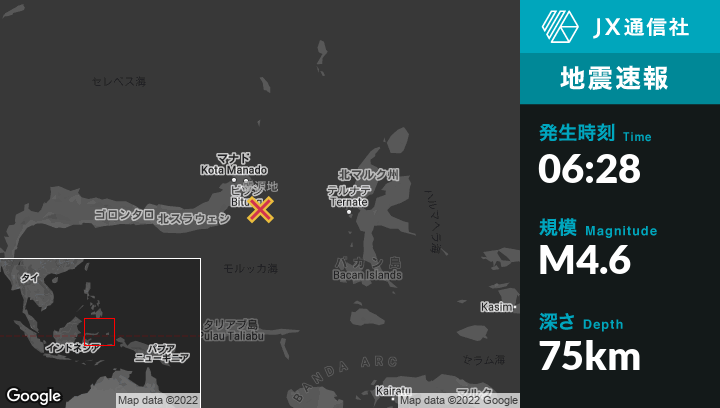 5月22日 06:28頃、インドネシアのTondanoから南東68kmの地点でM4.6の地震がありました。