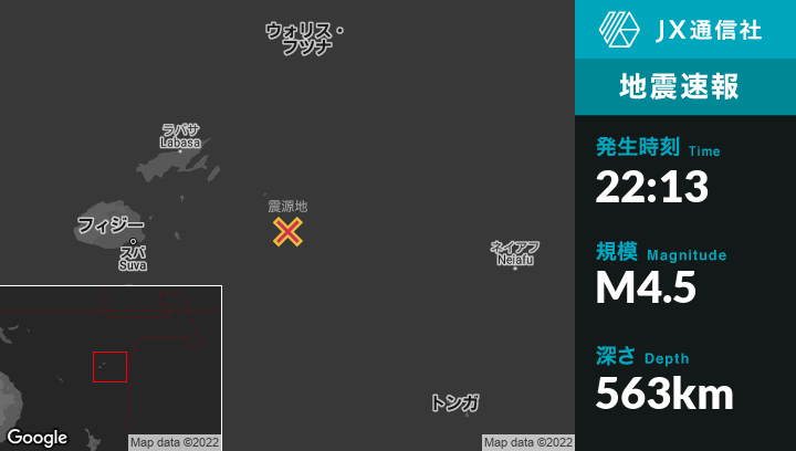 5月23日 22:13頃、フィジーのLevukaから東232kmの地点でM4.5の地震がありました。