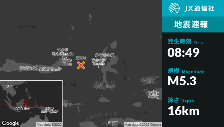 | 震源地 | Laikit II(Dimembe)、インドネシアのLaikitから東南東138kmの地点 |