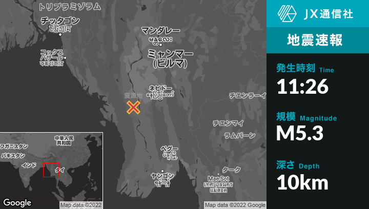| 震源地 | ミャンマーのMyaydoから北西38kmの地点 |