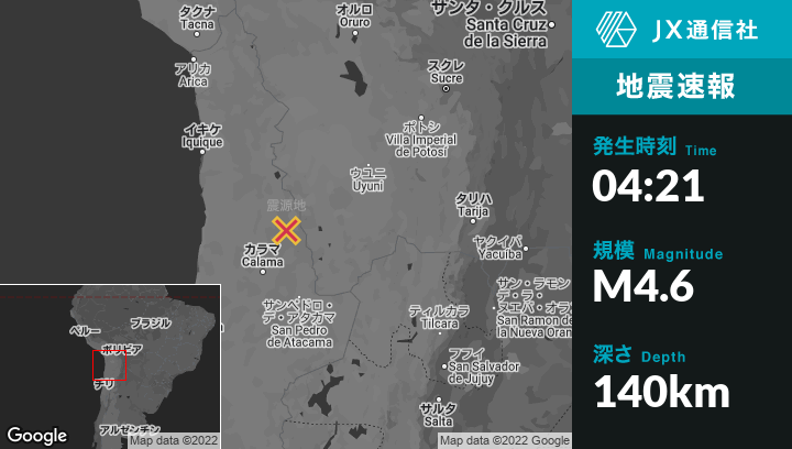 7月04日 04:21頃、チリのCalamaから北北東108kmの地点でM4.6の地震がありました。