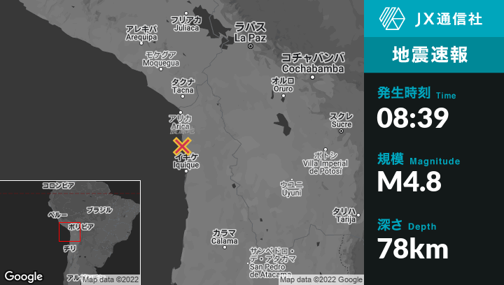 7月04日 08:39頃、チリのIquiqueから北93kmの地点でM4.8の地震がありました。
