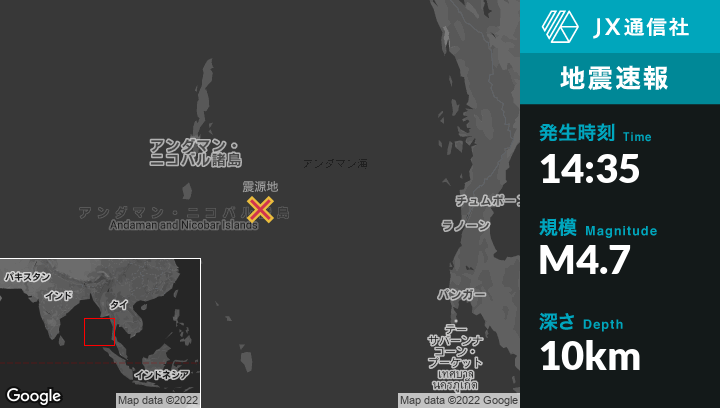 7月04日 14:35頃、インドのPort Blairから南東201kmの地点でM4.7の地震がありました。