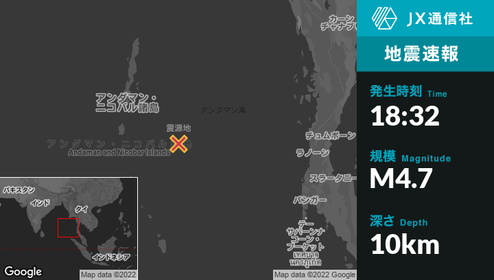 7月04日 18:32頃、インドのPort Blairから南東223kmの地点でM4.7の地震がありました。