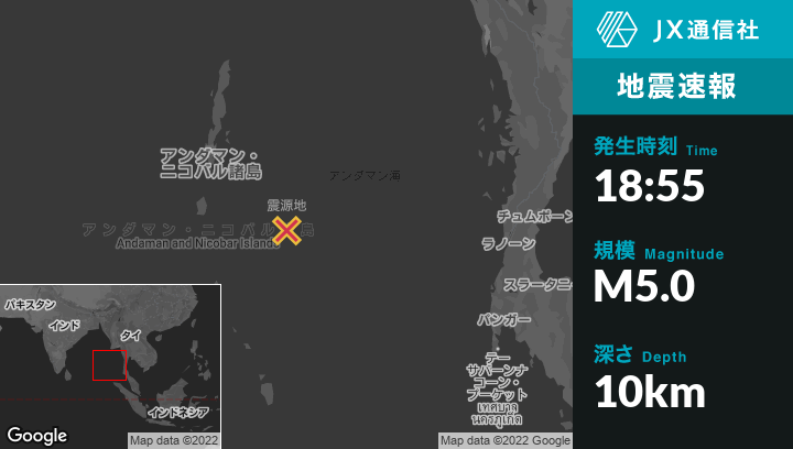 7月04日 18:55頃、インドのPort Blairから南東215kmの地点でM5.0の地震がありました。