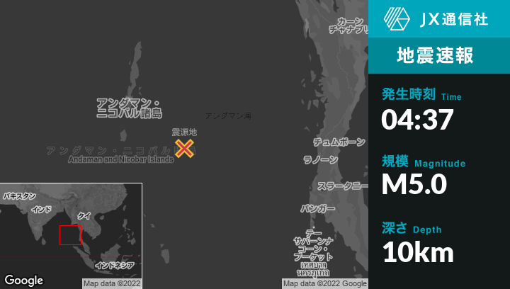 7月05日 04:37頃、インドのPort Blairから南東225kmの地点でM5.0の地震がありました。