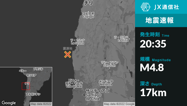 7月05日 20:35頃、チリのOvalleから西87kmの地点でM4.8の地震がありました。