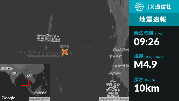 7月06日 09:26頃、インドのPort Blairから南東201kmの地点でM4.9の地震がありました。