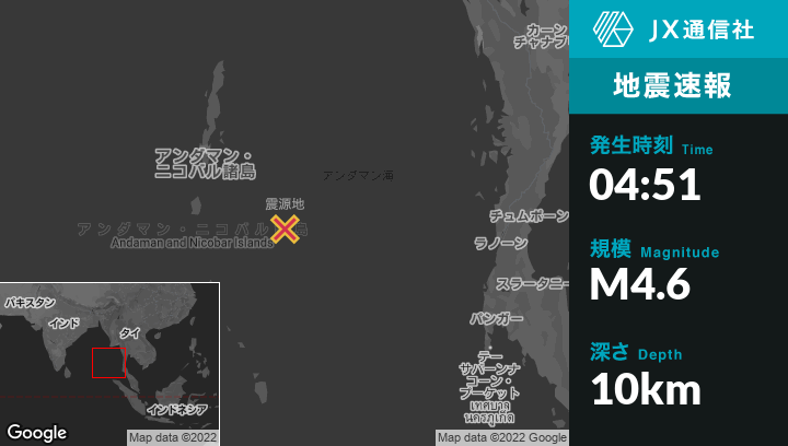 7月07日 04:51頃、インドのPort Blairから南東219kmの地点でM4.6の地震がありました。