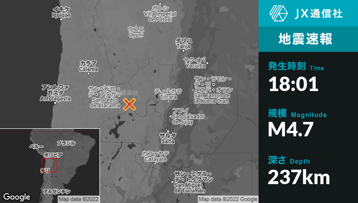 | 震源地 | アルゼンチンのSan Antonio de los Cobresから北西108kmの地点 |