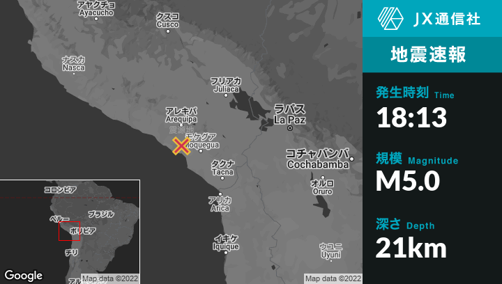 7月13日 18:13頃、ペルーのCocachacraから北東31kmの地点でM5.0の地震がありました。