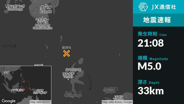 7月14日 21:08頃、インドネシアのTobeloから北北西177kmの地点でM5.0の地震がありました。