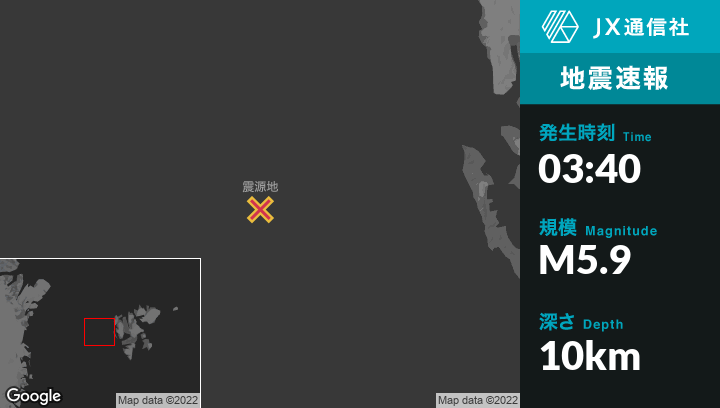| 震源地 | スバールバル諸島およびヤンマイエンのLongyearbyenから西219kmの地点 |