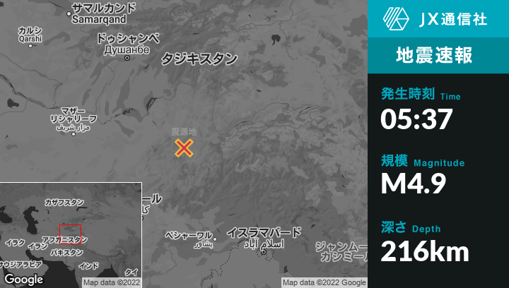 7月27日 05:37頃、アフガニスタンのJurmから南南西53kmの地点でM4.9の地震がありました。