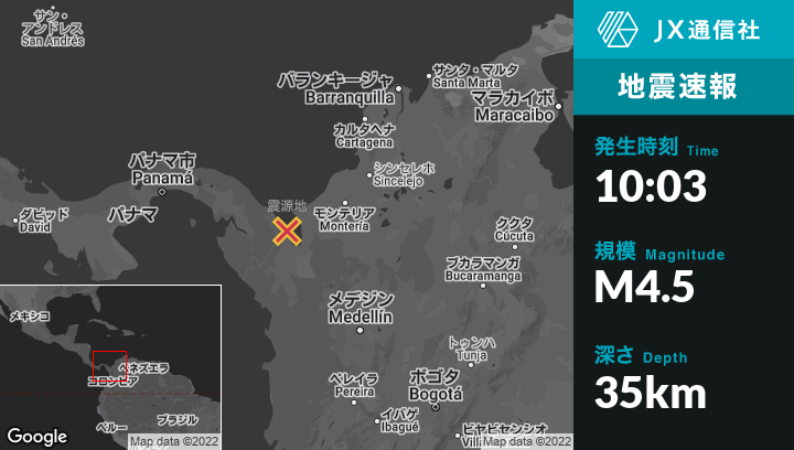 8月06日 10:03頃、コロンビアのNecoclíから西南西29kmの地点でM4.5の地震がありました。