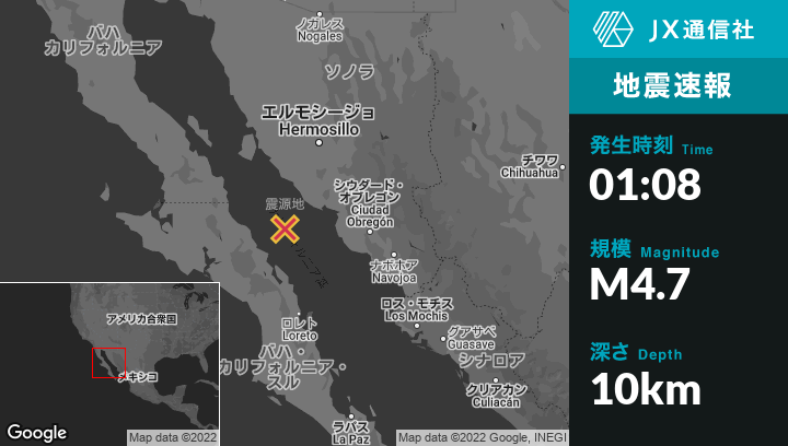 8月07日 01:08頃、メキシコのSan Carlosから西南西68kmの地点でM4.7の地震がありました。