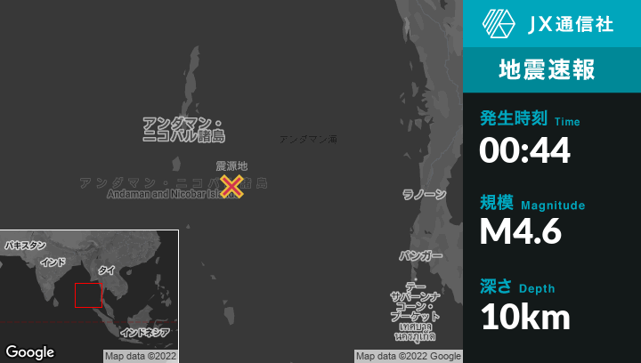 8月08日 00:44頃、インドのPort Blairから南東194kmの地点でM4.6の地震がありました。