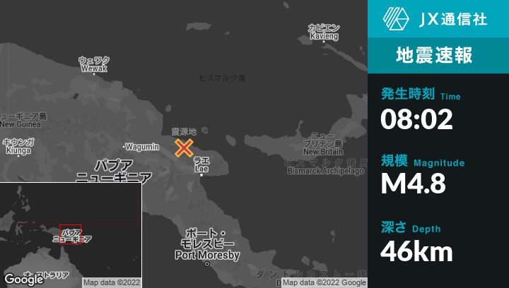 8月08日 08:02頃、パプアニューギニアのKainantuから北東89kmの地点でM4.8の地震がありました。
