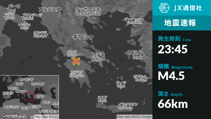 8月08日 23:45頃、ギリシャのAígioから南南西11kmの地点でM4.5の地震がありました。