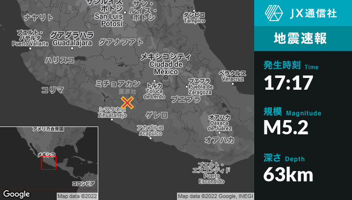 | 震源地 | メキシコのZirándaro de los Chávezから東11kmの地点 |