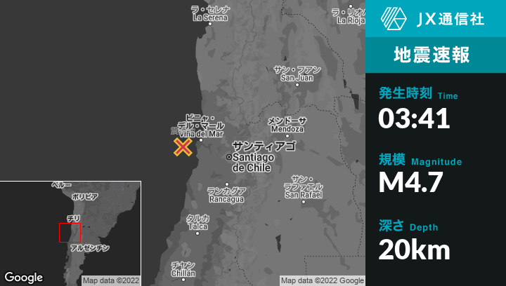 8月15日 03:41頃、チリのValparaísoから西45kmの地点でM4.7の地震がありました。